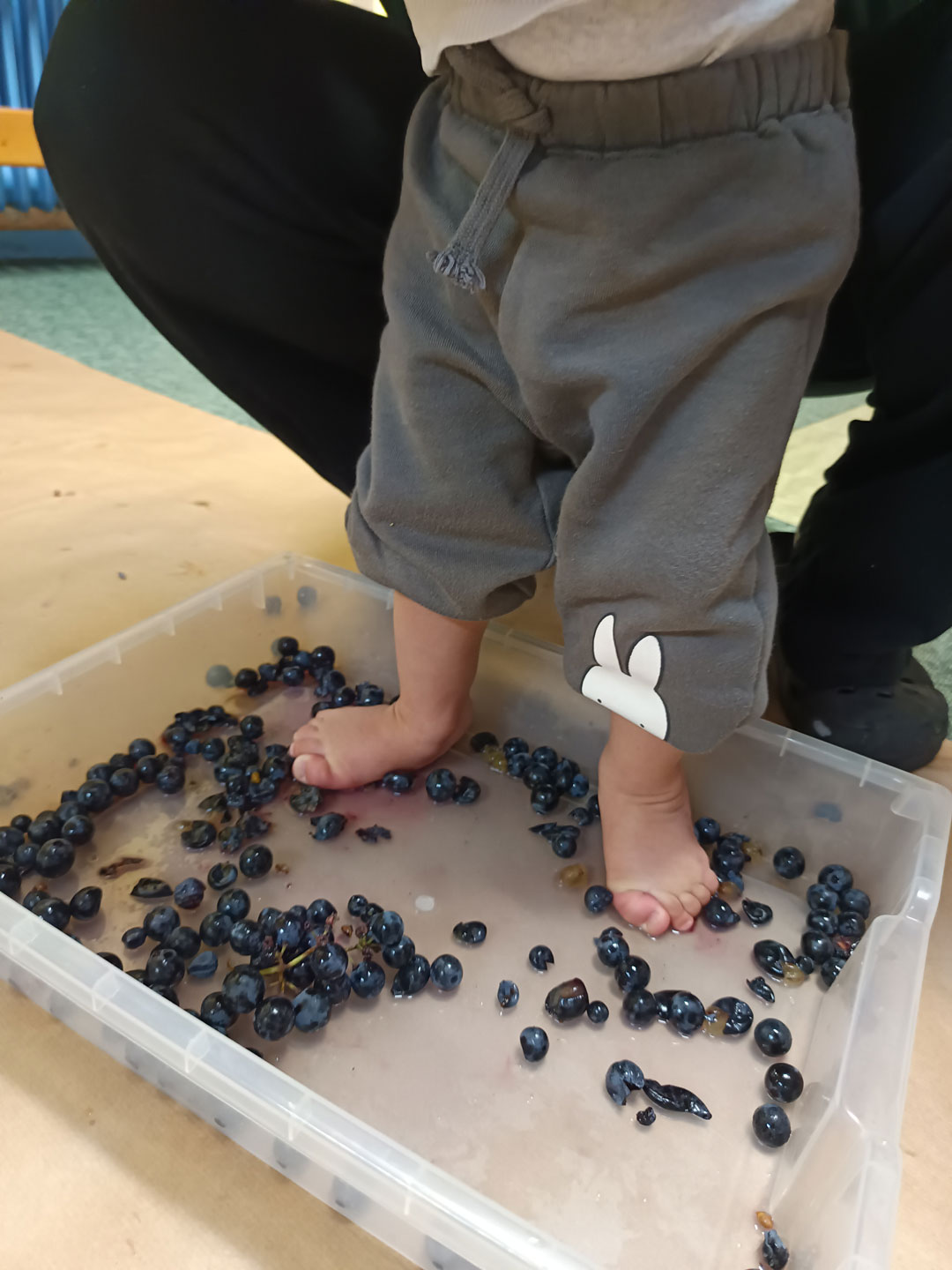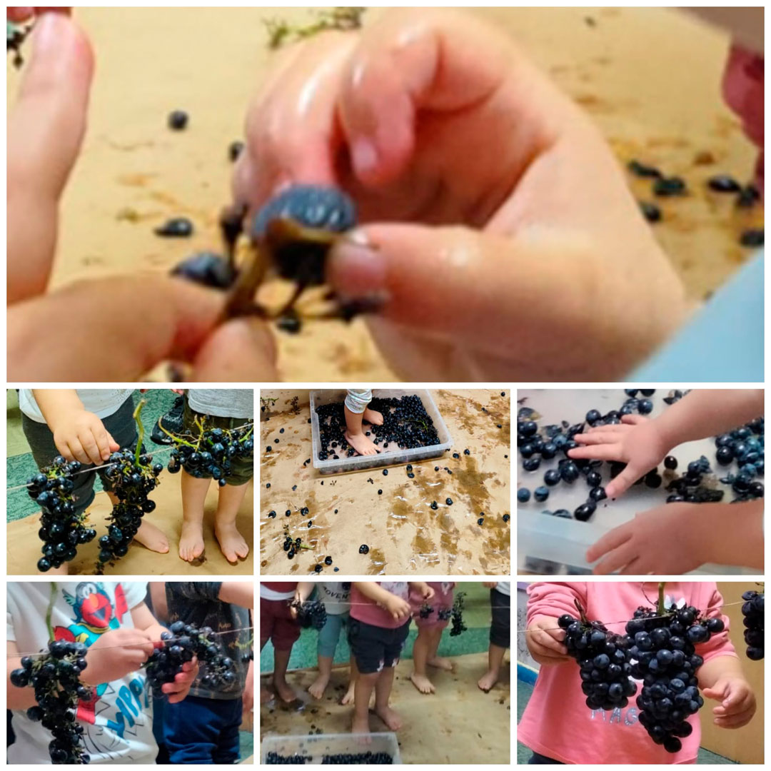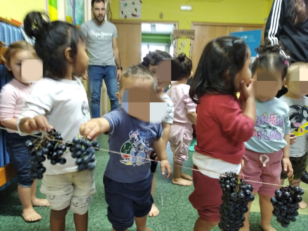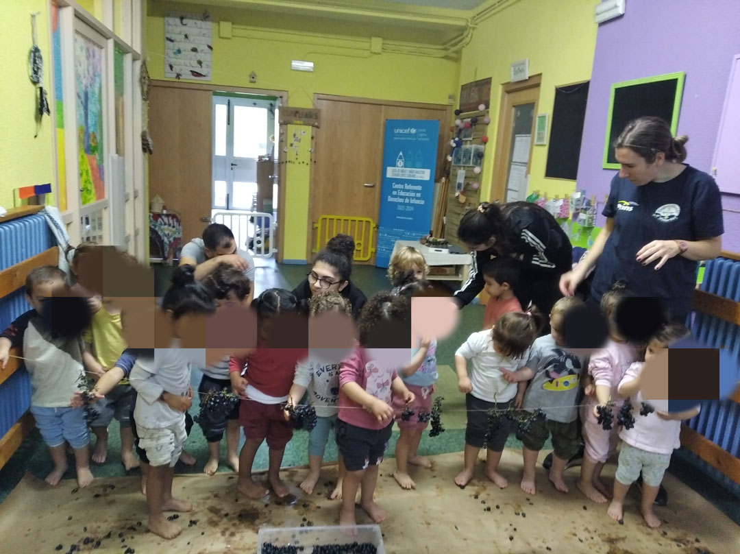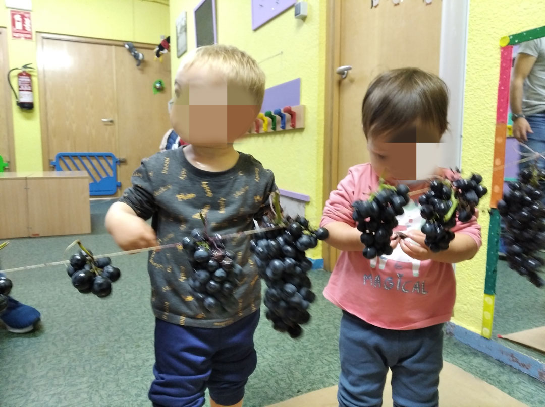 La Casa de Niñas y Niños Maestro Claudio de Valladolid se ha sumado a las actividades con motivo de la Fiesta de la Vendimia. Han acudido algunas familias para ayudarnos a colgar los racimos de uvas en cuerdas a la altura de niñas y niños, que fueron cogiendo las uvas y comiéndoselas o echándolas en una gaveta para después pisarlas y hacer mosto.