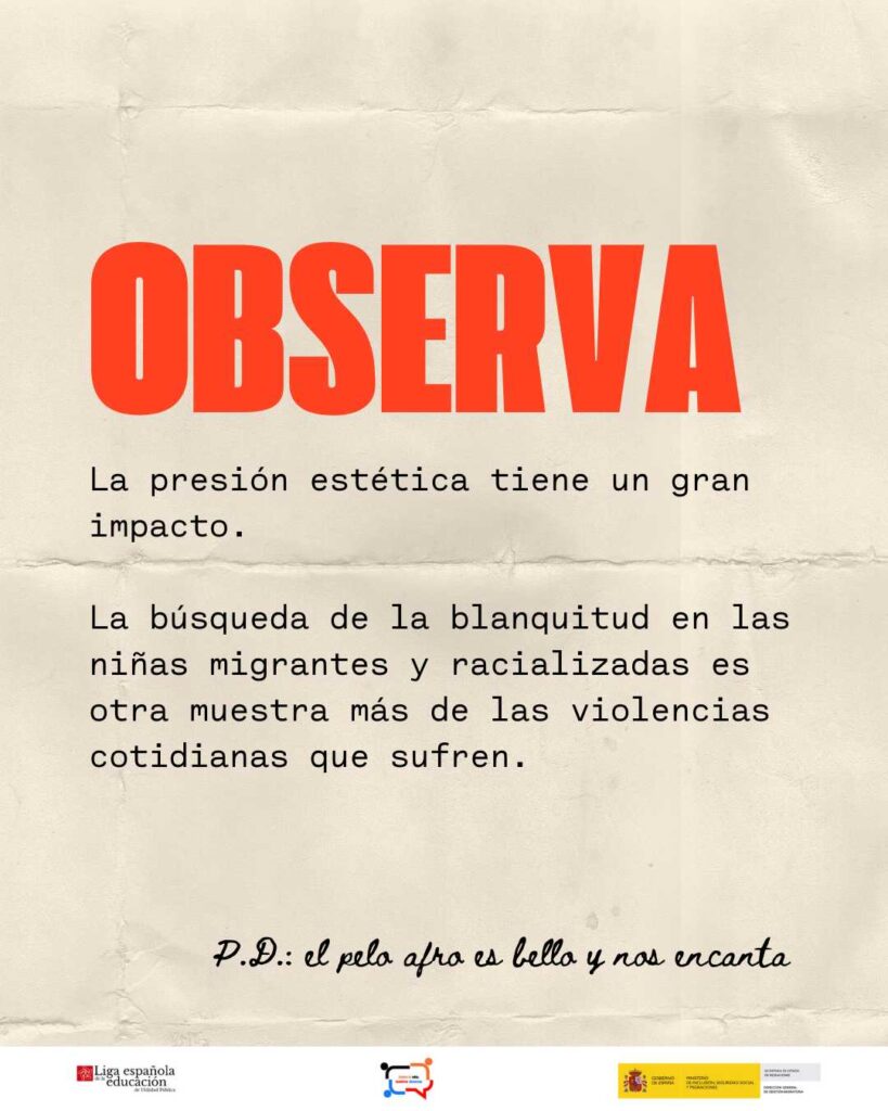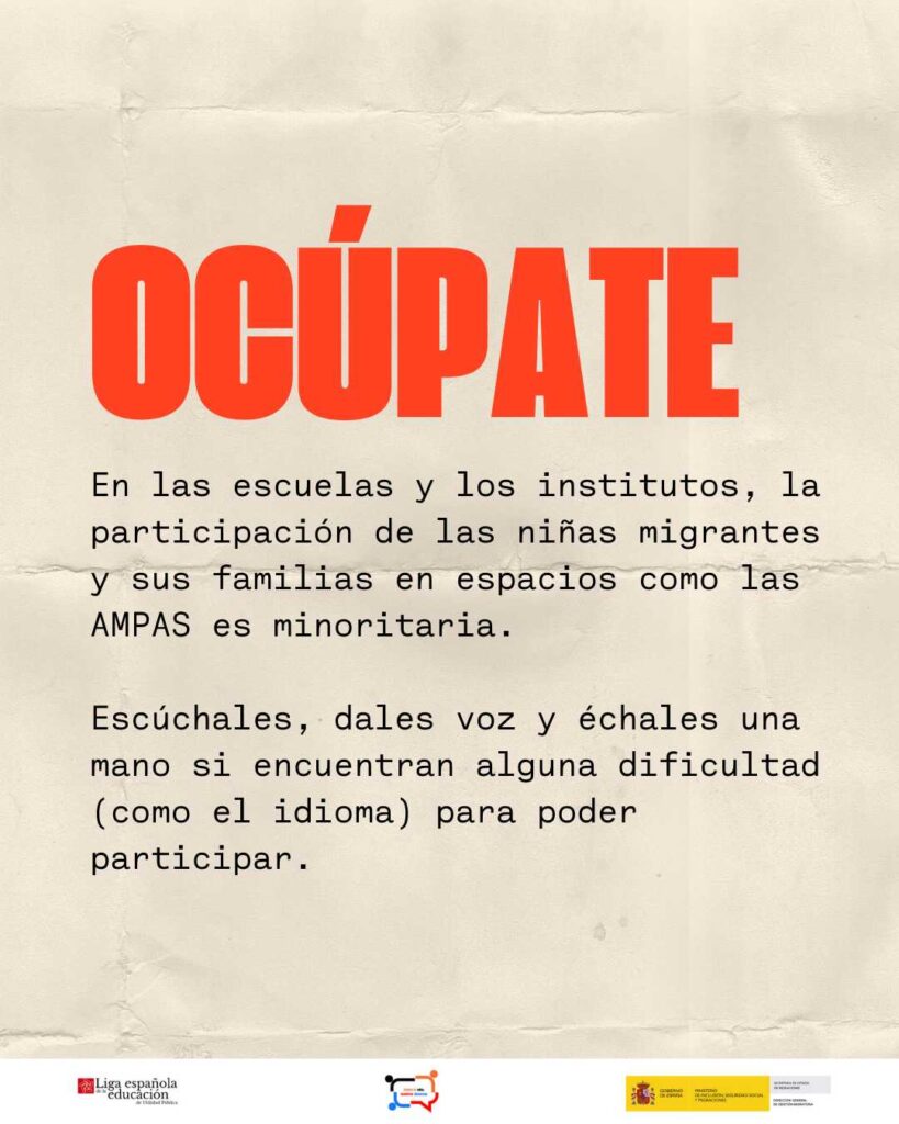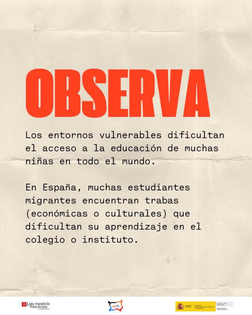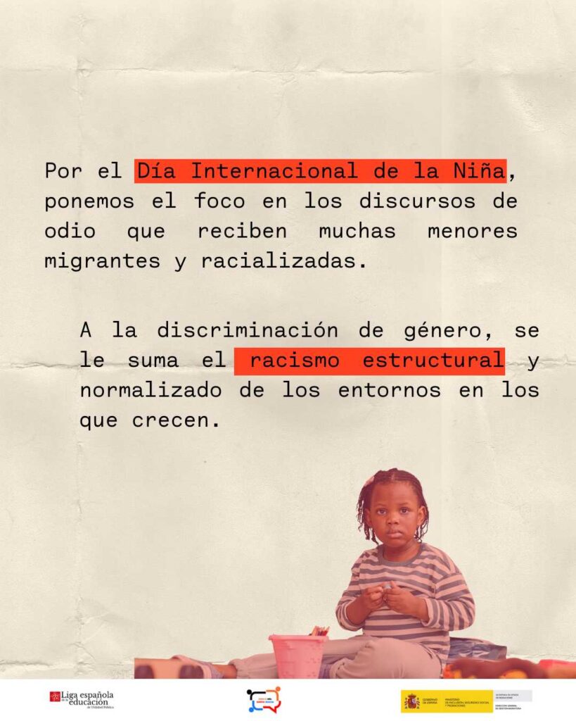 Con motivo del 11 de octubre, Día Internacional de la Niña, el programa ‘Contra tu odio, nuestros discursos’, financiado por el Ministerio de Inclusión, Seguridad social y Migraciones y ejecutado por Liga Española de la Educación y la Cultura Popular lanza la campaña ‘Observa, denuncia y ocúpate del cambio‘’ para denunciar la doble discriminación machista y racista que sufren muchas niñas.