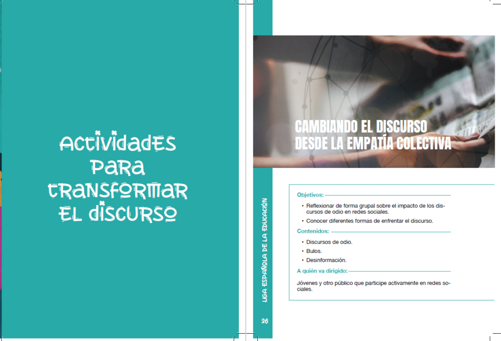 La ONG Liga Española de la Educación y la Cultura Popular presenta la guía práctica de sensibilización “Combatir los discursos de odio”, un material elaborado en el marco del proyecto Contra tu odio, nuestros discursos, financiado por el Ministerio de Inclusión, Seguridad Social y Migraciones. Esta publicación surge de la necesidad urgente de concienciar, desde las aulas, sobre una de las problemáticas sociales más dañinas: los discursos de odio.