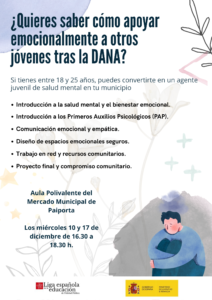 El programa Espacio Emocional DANA, focalizado en la recuperación de la salud mental de los y las jóvenes afectados/as por la catástrofe del octubre de 2024, inicia una formación para jóvenes gratuita en Paiporta.