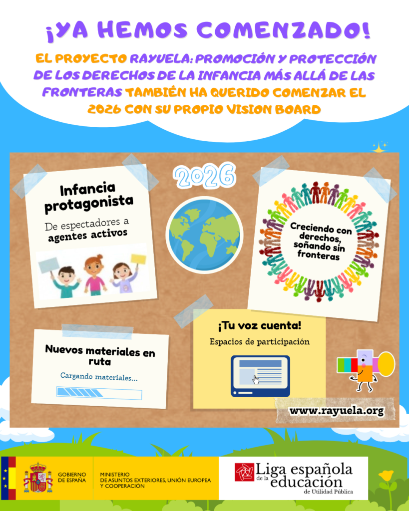 El proyecto ‘Rayuela: Promoción y protección de los derechos de la infancia más allá de las fronteras‘, financiado por el Ministerio de Asuntos Exteriores, Unión Europea y Cooperación, ha comenzado de nuevo su actividad en la difusión de los derechos de niños, niñas y adolescentes de todo el mundo. Para inaugurar este nuevo proyecto, que durará hasta el 30 de abril, presenta su ‘Vision Board’ anual, una hoja de ruta visual que refleja sus prioridades estratégicas y su apuesta por una infancia más participativa y protagonista.